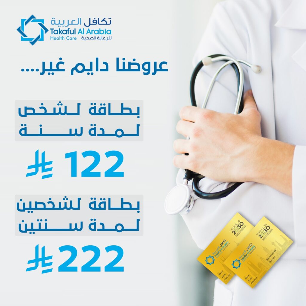 نقدم لكم بطاقة تكافل العربية تمنح حاملها خصم على جميع التخصصات الطبية في القطاع الصحي
